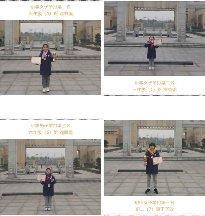 經過緊張激烈的角逐,我川南衡中乒乓球隊的孩子們憑借頑強拼搏的精神斬獲小學女子單打第一名、第二名,小學男子單打第三名,初中女子單打第一名,初中男子團體第二名,高中男子團體第三名的佳績。葛欣老師榮獲“優秀教練”稱號。