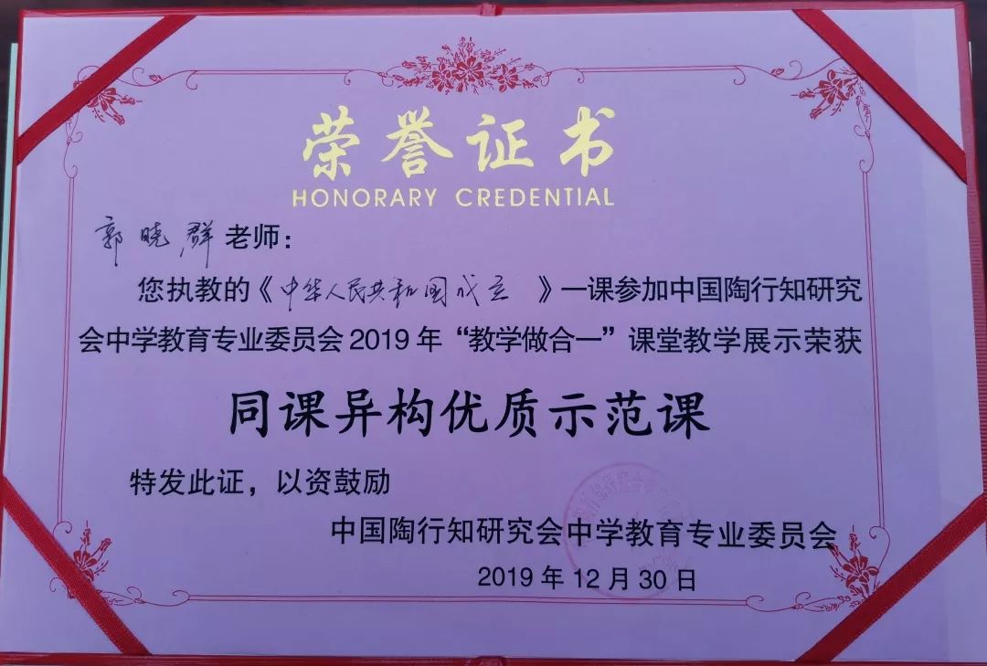 12月28日至31日,中國陶行知研究會中學教育專業委員會2019年全國學術年會在重慶市璧山中學隆重召開,來自全國20多個省(市)自治區的專家學者、教師代表近1000人出席了該年會。在年會課堂教學展示觀摩活動中,我校教師鄒玲、郭曉群所執教的展示課被評為同課異構優質示范課。