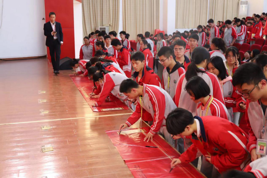 各班學生分別到臺前簽名,表達自己的雄心壯志,堅持砥礪前行。一個個形各異卻志相同的名字仿佛在無聲地宣告同學們必定將努力落實在行動上的決心。
